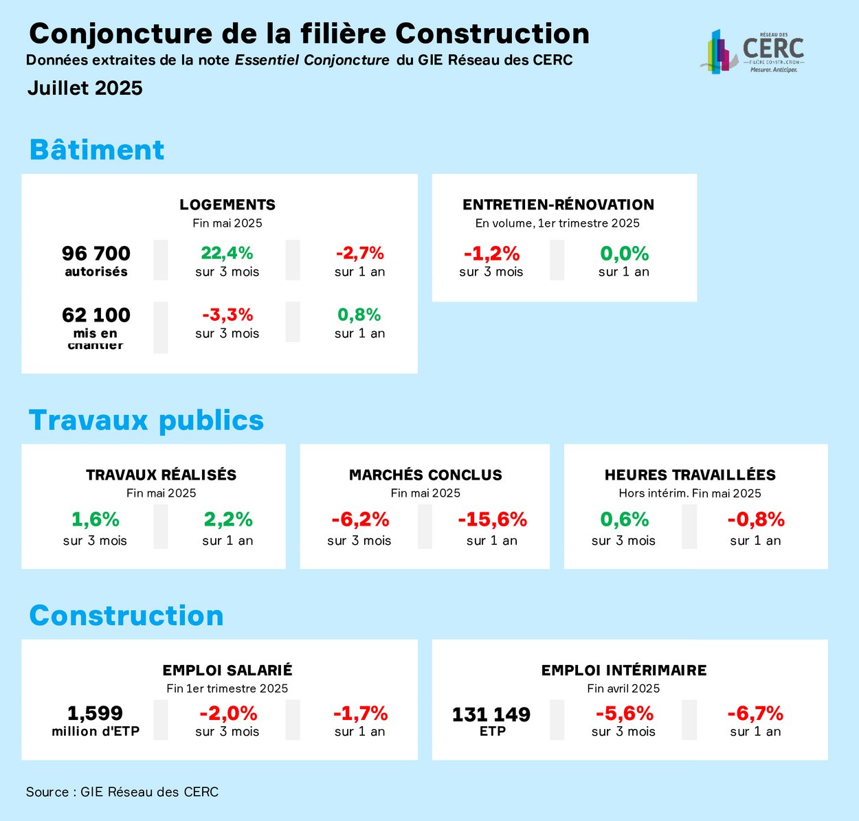 Dans sa note n°132 (15 juillet 2025) sur la conjoncture de la filière construction, le réseau des CERC analyse, comme chaque mois, les évolutions de l’activité et de l’emploi au cours des trois derniers mois et sur un an, globalement et par région.