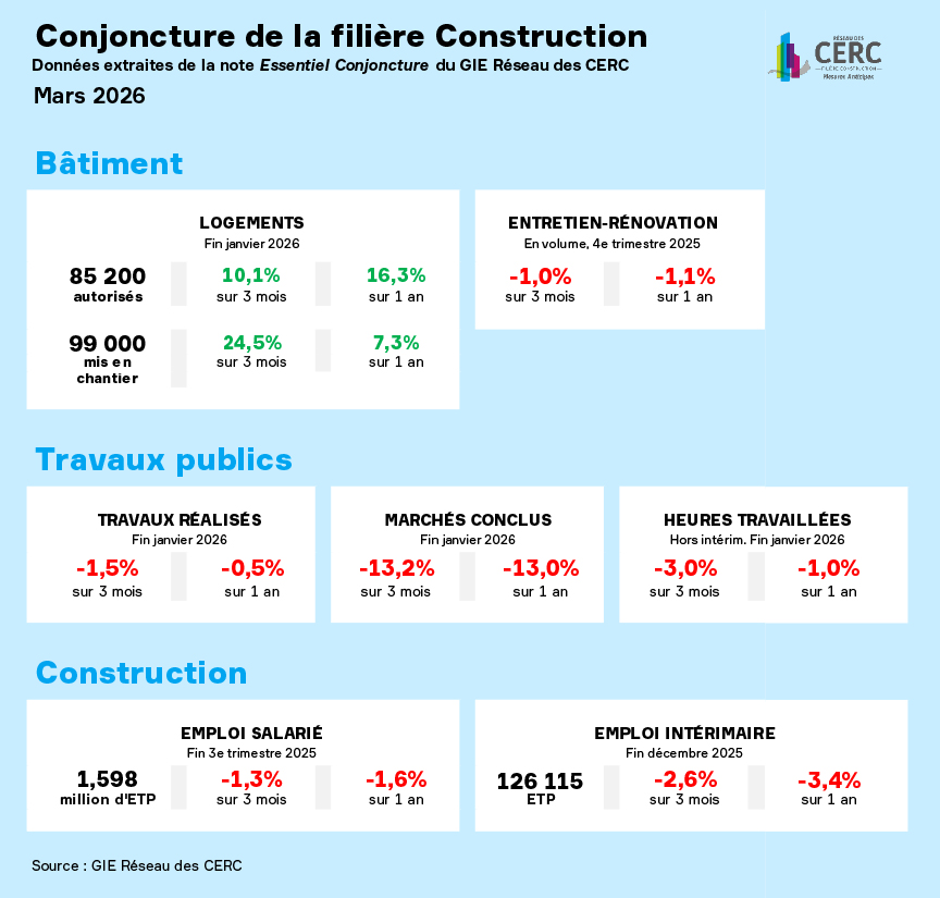 Dans sa note de mars 2026 sur la conjoncture de la filière construction, le réseau des CERC révèle un secteur aux dynamiques divergentes, où le redressement technique de la production neuve peine à masquer l’atonie de la demande et le repli des autres segments.